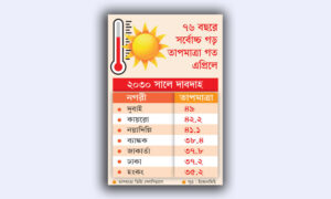 এপ্রিল মাস ছিল দেশে গত ৪৩ বছরের মধ্যে সবচেয়ে শুষ্ক। এ মাসে সর্বোচ্চ গড় মাপমাত্রা ছিল ৩৬.২ ডিগ্রি সেলসিয়াস, যা স্বাভাবিকের চেয়ে ৩ ডিগ্রি বেশি। এপ্রিলের এই তাপমাত্রা গত ৭৬ বছরের মধ্যে সবচেয়ে বেশি।