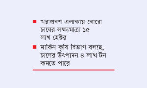 এদিকে দেশের চাল উৎপাদন পরিস্থিতি নিয়ে শঙ্কার তথ্য দিয়েছে যুক্তরাষ্ট্রের ইউনাইটেড স্টেটস ডিপার্টমেন্ট অব অ্যাগ্রিকালচার (ইউএসডিএ)। সংস্থাটির বৈদেশিক কৃষিসেবা বিভাগের (এফএএস) ‘ওয়ার্ল্ড অ্যাগ্রিকালচারাল প্রডাকশন’ শীর্ষক প্রতিবেদনে বলা হয়েছে, ধানের আবাদ কমে যাওয়া ও প্রাকৃতিক দুর্যোগের কারণে বাংলাদেশে এবার চালের উৎপাদন চার লাখ টন কমতে পারে।